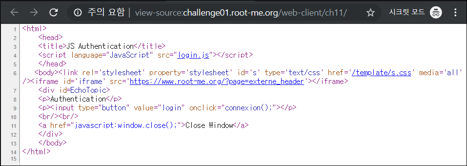 문제 들어가보니 그냥 달랑 로그인 버튼밖에 없네요. 일단 소스보기를 해봅니다.
