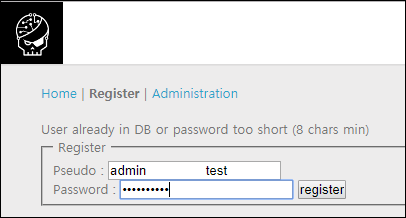 사용자 이름을 admin+(공백 15자)+임의 문자열을 입력하고, 원하는 패스워드 입력 후 등록 버튼을 클릭하면,