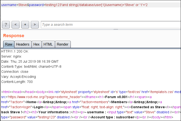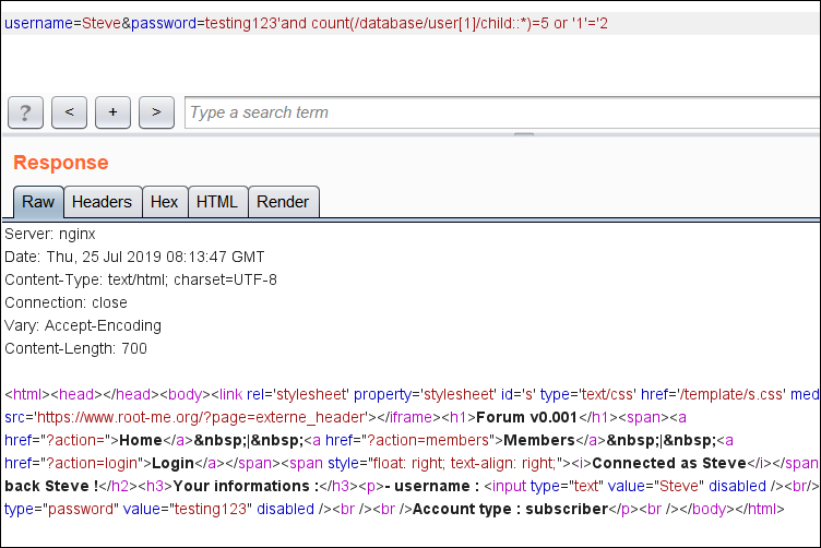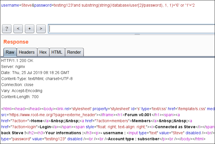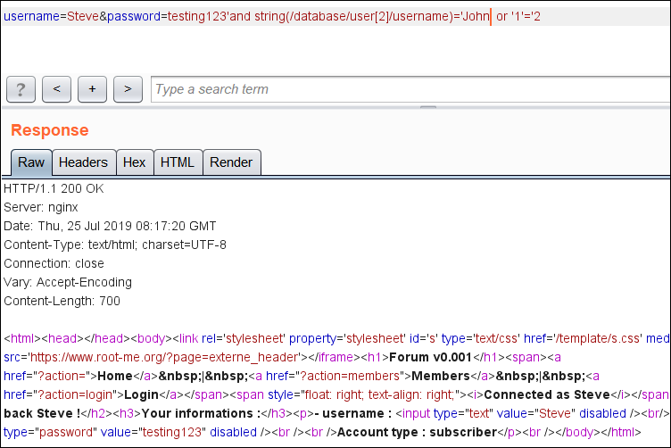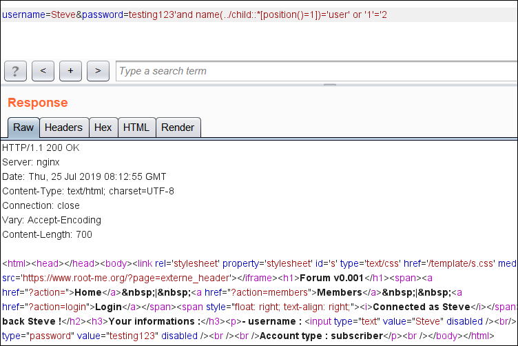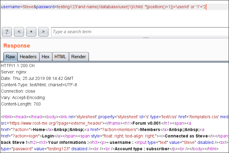 'and string(/database/user[1]/username)='Steve' or '1'='2