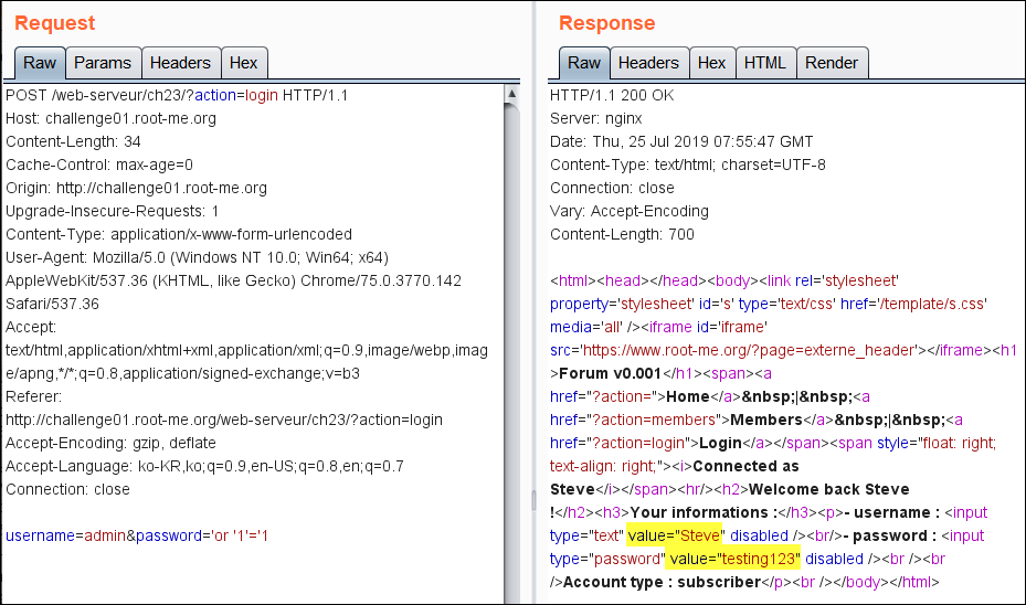 이번에는 username : admin / password : 'or '1'='1 값을 입력해보았더니, Steve 계정으로 로그인이 되었습니다.