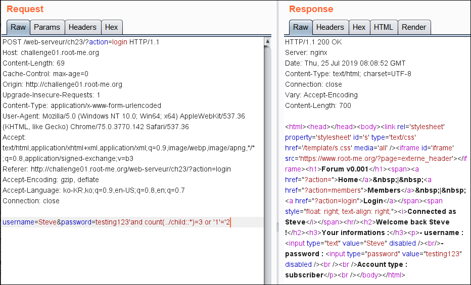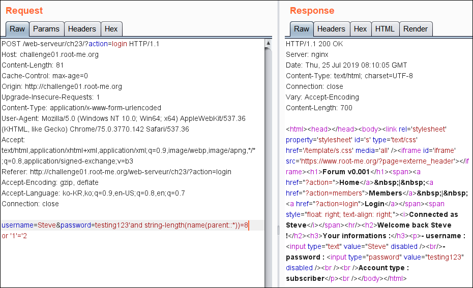 확실하게 Xpath Injection이 가능하다는 판단을 할 수 있습니다.