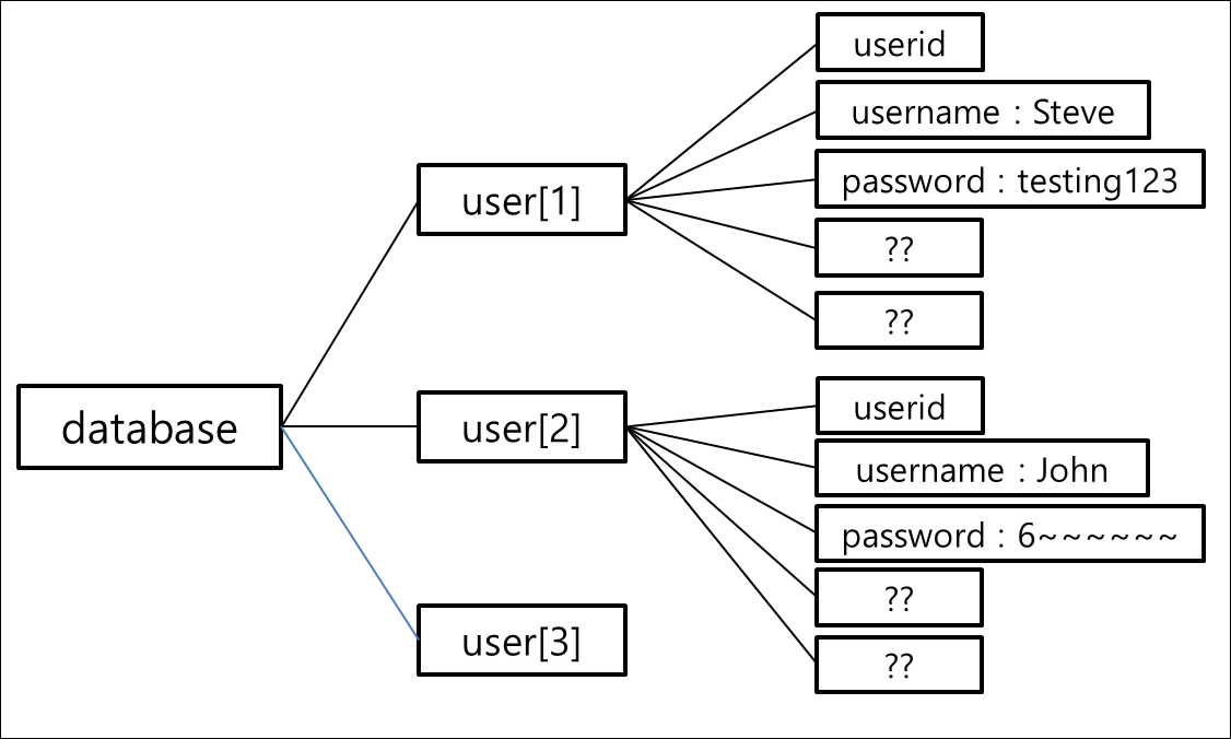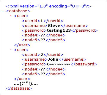 그래서 부모 노드(database)의 두번째 user 노드의 username 값을 확인하였더니 John, 즉 관리자가 들어 있는 것을 확인할 수 있습니다. 두번째 노드의 패스워드 값만 알면 되겠네요.