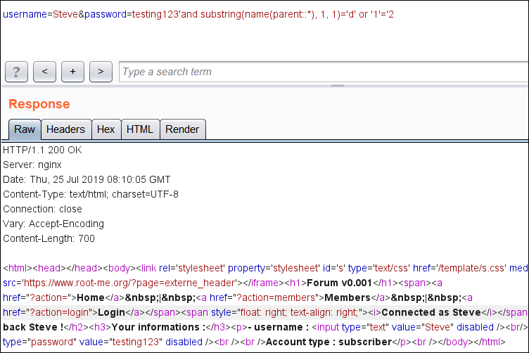 위의 결과로 인해 첫번째 user 노드의 username 값이 Steve 임을 알아낼 수 있죠.