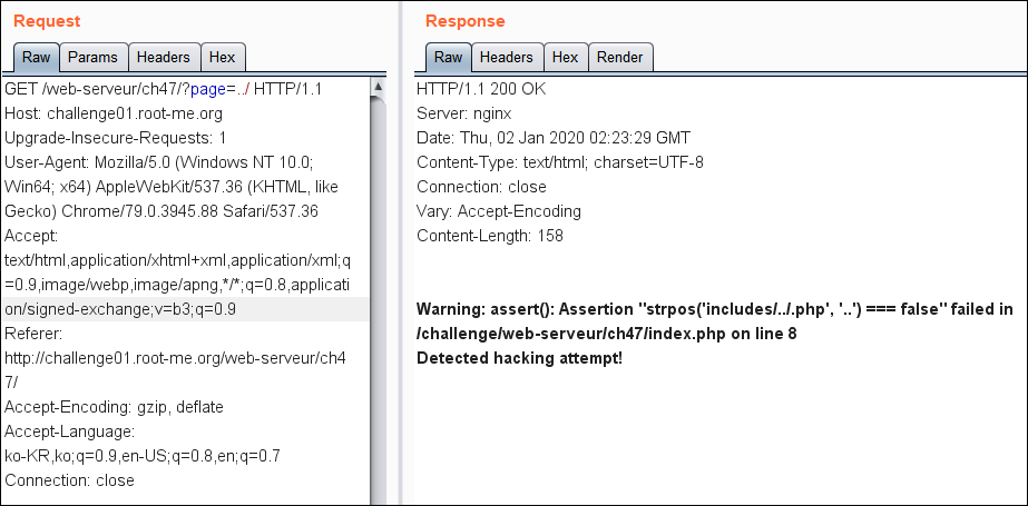 strpos 함수는 문자열이 포함되는지 검사하는 함수인데, 문자 ".." 때문에 공격이 탐지됨을 알 수 있습니다.