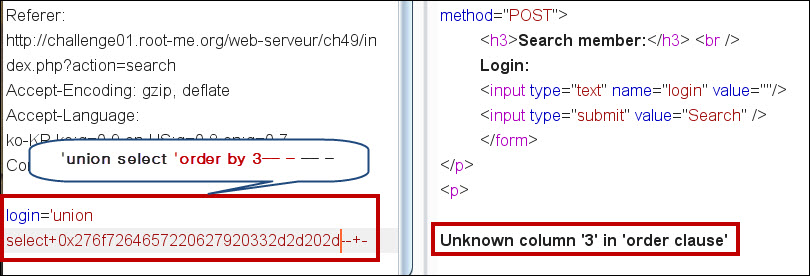 'union select 0x276f7264657220627920332d2d202d--+- 쿼리를 입력할 경우, 에러가 출력되고 있기 때문에, 필드 수는 2개 임을 확인할 수 있습니다.
