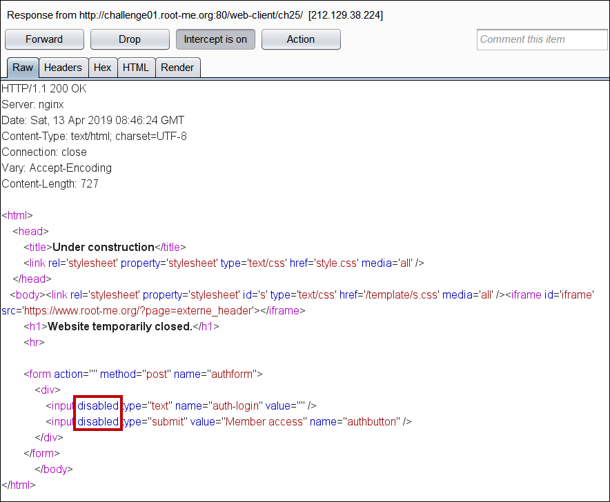웹 프록시 도구에서 전송된 응답 값에서 입력 폼과 버튼 부분을 찾아, 그 곳에 "disabled" 속성이 있길래 이걸 그냥 삭제해보았다.