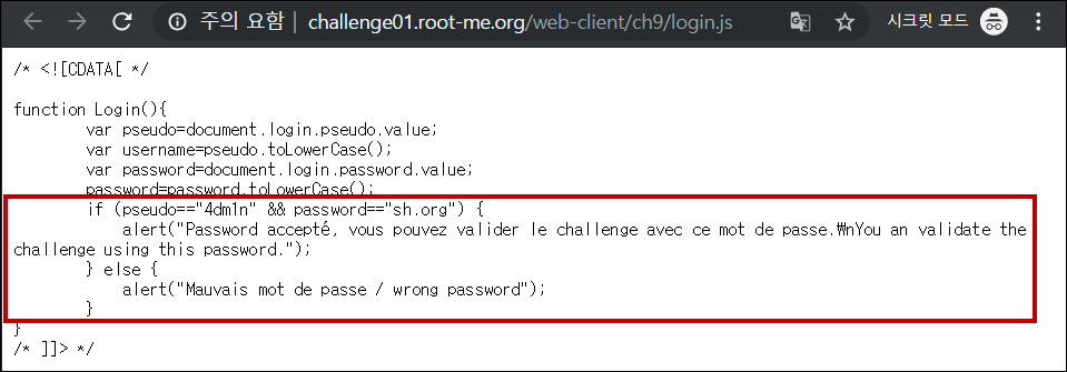 login.js 파일 분석을 해봅니다. id가 4dm1n이고 password가 sh.org일 경우 정상적으로 로그인이 된다는 로직입니다.
