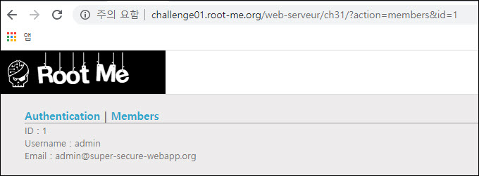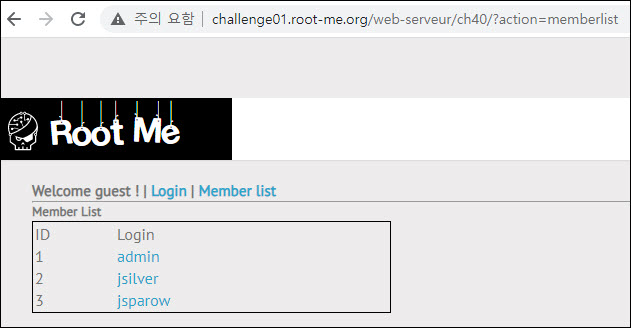 "admin"을 클릭하면 URL 상에 GET 메소드로 action과 id 파라미터가 전송되는 것을 볼 수 있습니다.