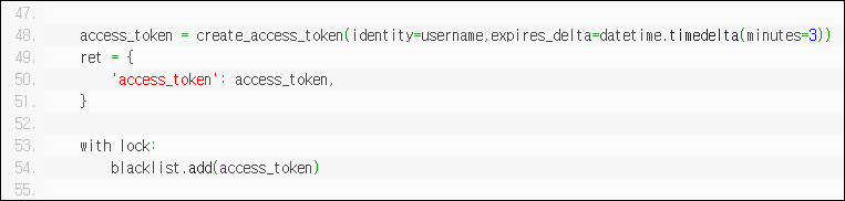 문제 페이지 내에 있는 소스코드를 분석해보니, access_token 값의 유효 시간은 3분이고 해당 값을 발급하자마자 Black List로 보내버립니다. 즉, 저희는 유효하지만 발급되지 않은 JWT 토큰 값이 필요합니다.