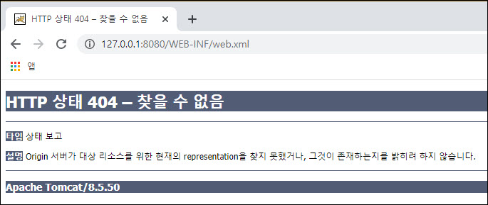만약, 웹 상으로 웹 서버 설정파일인 web.xml에 접근 시도 시 위와 같이 에러가 발생합니다.